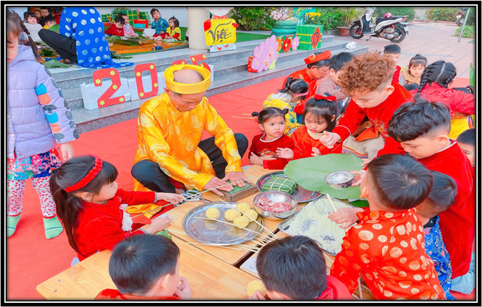 Các bé tỏ ra rất thích thú và hào hứng khi được ông bà, bố, mẹ và các cô hướng dẫn quy trình làm ra một chiếc bánh chưng xanh. Qua đó các con sẽ hiểu thêm về ý nghĩa của những chiếc “Bánh chưng” và ý nghĩa về tình yêu dân tộc, sự gắn kết giữa con người với con người trong ngày Tết cổ truyền dân tộc. Đây cũng là món quà trải nghiệm thật ý nghĩa mà các cô dành tặng các con trước khi đón Tết Ất tỵ năm 2025