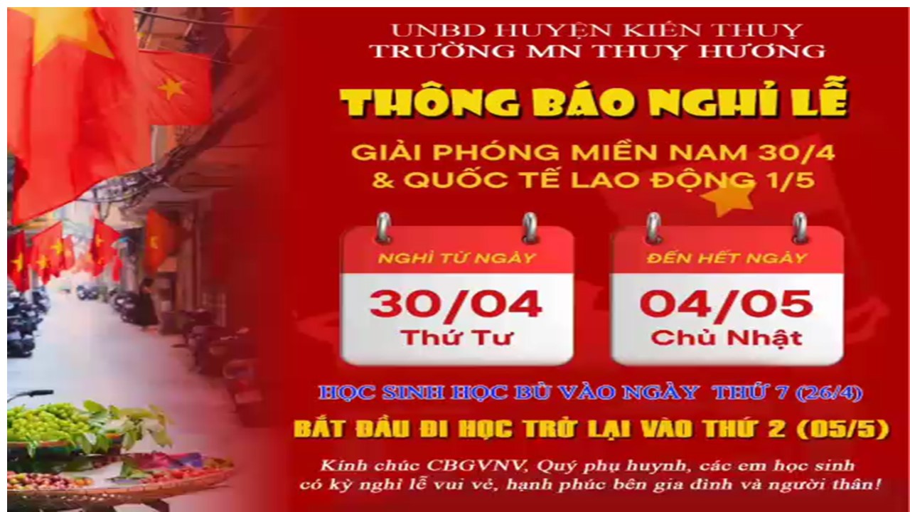 Trường Mầm non Thụy Hương thông báo lịch nghỉ lễ 30/4 - 01/5