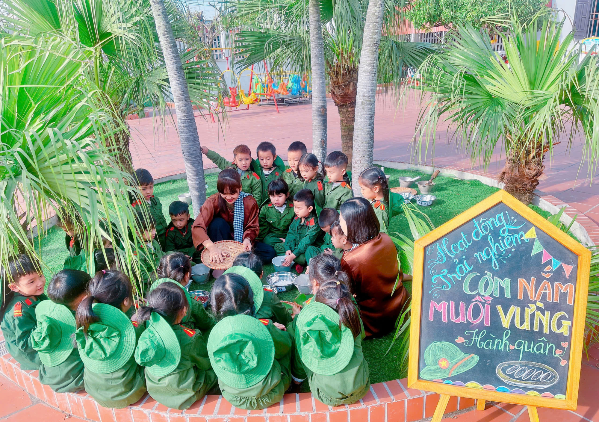🍱 👉Buổi trải nghiệm diễn ra trong không khí vui tươi và phấn khởi. Bé nào cũng thích thú khi lần đầu được trải nghiệm cảm giác “ăn cơm hành quân” giống như những người lính thực thụ.