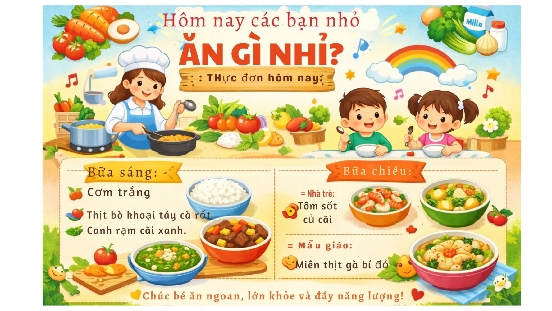 Mỗi bữa ăn tại trường mầm non không chỉ là bữa ăn no mà còn là nguồn năng lượng giúp các con vui khỏe, học tập và vui chơi suốt cả ngày.