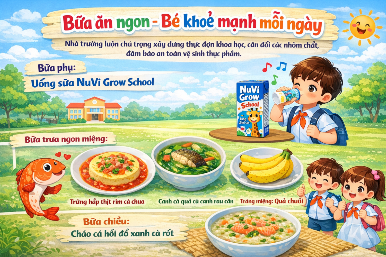 🍀 Với thực đơn phong phú, đa dạng và hợp khẩu vị, nhà trường mong muốn mang đến cho các bé những bữa ăn ngon miệng, đầy đủ dinh dưỡng, giúp trẻ luôn khỏe mạnh, vui tươi và học tập hiệu quả.